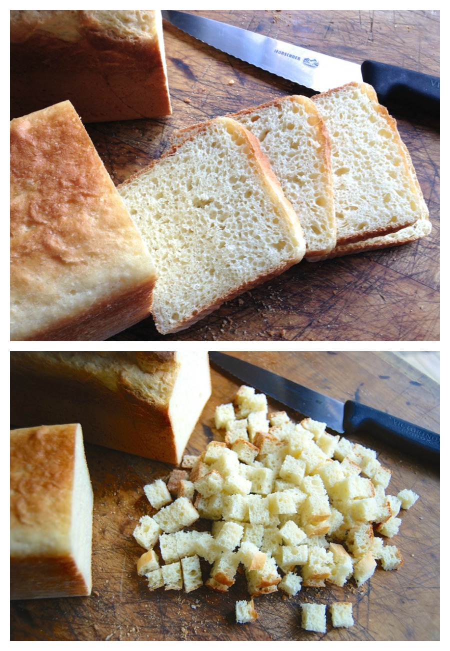 You want the bread to be a bit stale, so it doesn't lose its body entirely in your stuffing.
