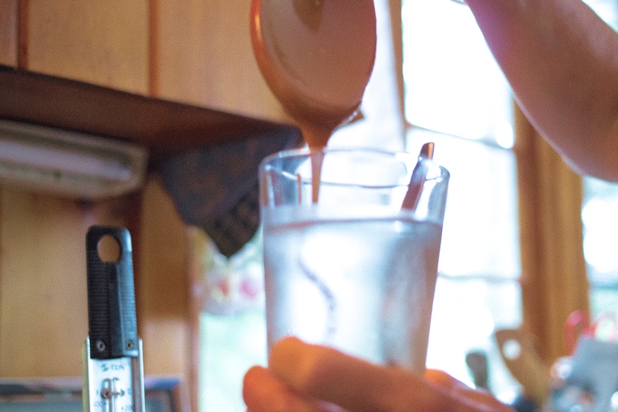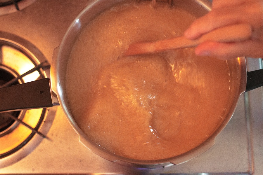 Once you've verified the candy has reached its desired temperature of 248°F, remove it from the heat and stir in the vanilla extract. The caramel mixture will sizzle and crackle and react quite excitedly.