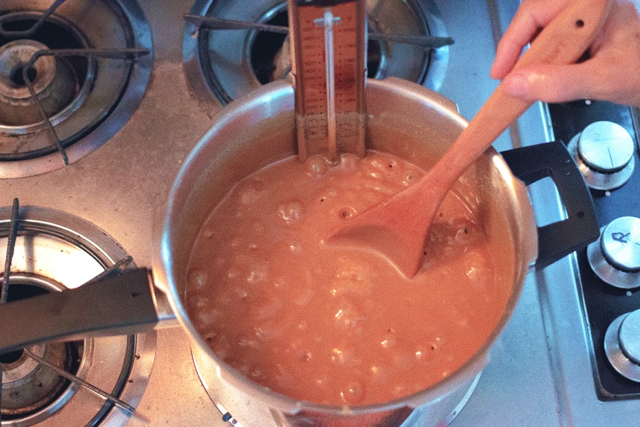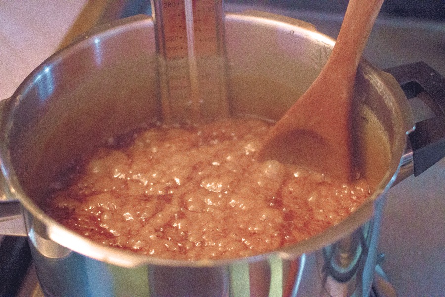 Heat over medium-low heat until all the ingredients are melted, stirring constantly. Clamp a candy thermometer onto the side of the pan. Heat slowly, stirring constantly, until the thermometer reads 248°F.