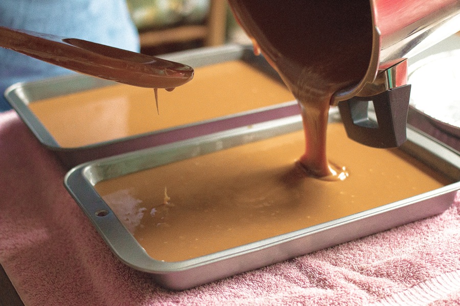 Scrape the caramel that doesn't pour readily from the pan into a buttered “scrap” pan. This is for sampling.