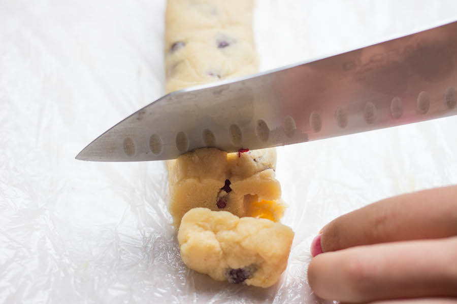 Once your dough comes together, add 1/2 teaspoon orange zest (grated orange rind) and 1/4 cup dried cranberries. Again, wrap, roll, chill, and slice, then bake at 350°F for 12 to 14 minutes. Then cool your cookies just as you did above – on the pan for 10 minutes, then transferred to a rack to finish cooling.
