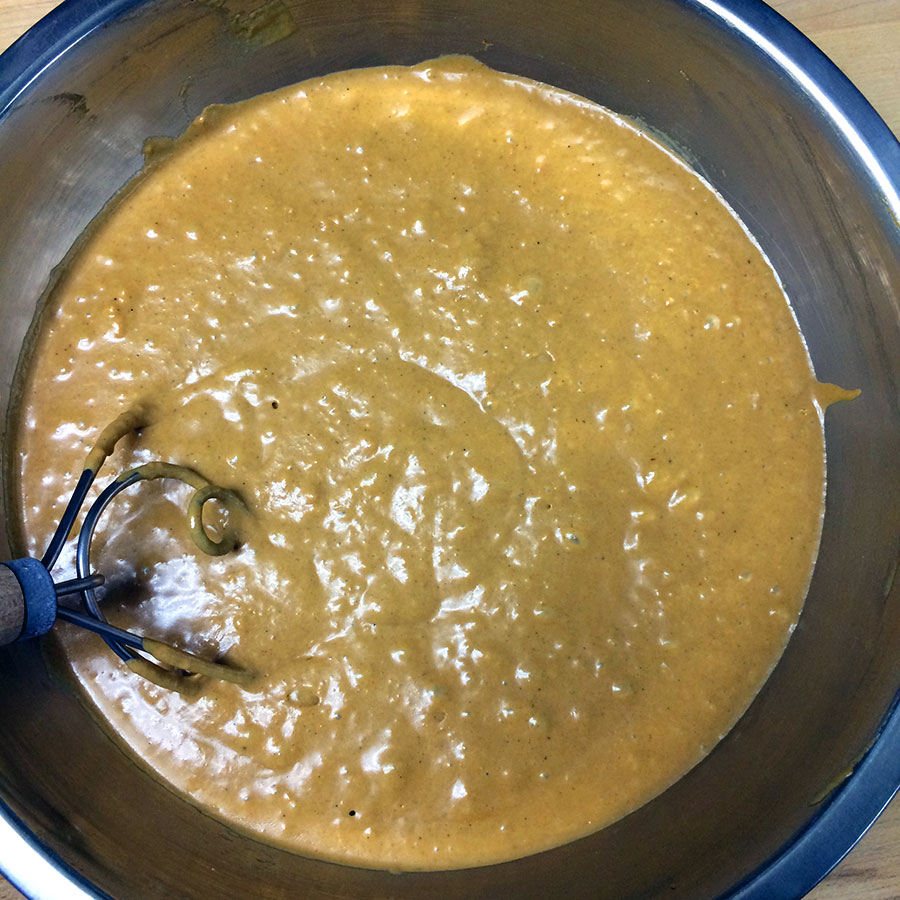 Mix together the wet and dry ingredients until just combined. It’s OK if the mixture isn’t perfectly smooth; a few lumps are fine. I prefer using our dough whisk to a spoon; it's just more efficient at mixing batters, and keeps the lumps to a minimum.
