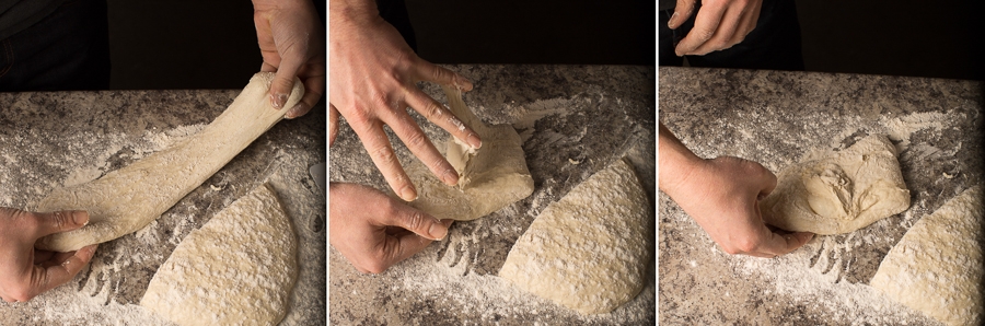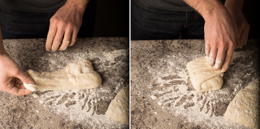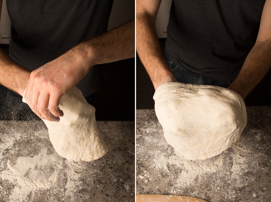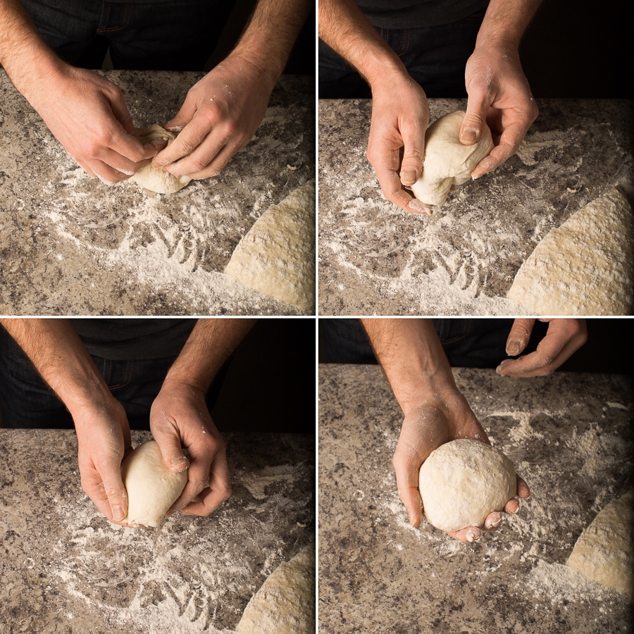 Gently pull the ends towards the middle of the dough, then turn it over. Using your fingers, pull the dough under itself until the top is smooth, and the seams have been worked into the bottom of the dough.