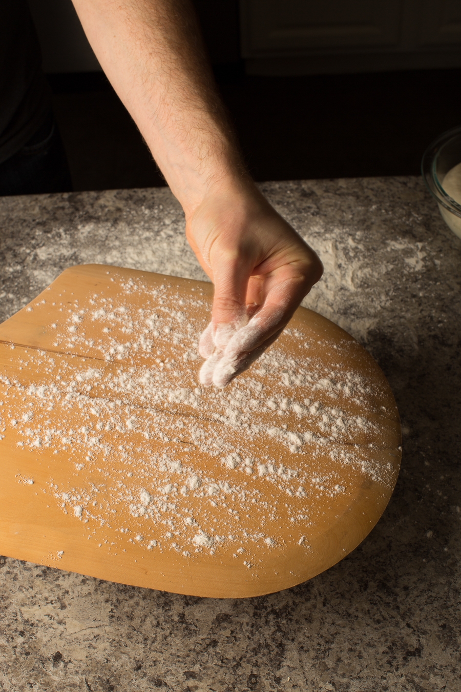 Generously flour a wooden* peel, rubbing flour into the board to completely coat.