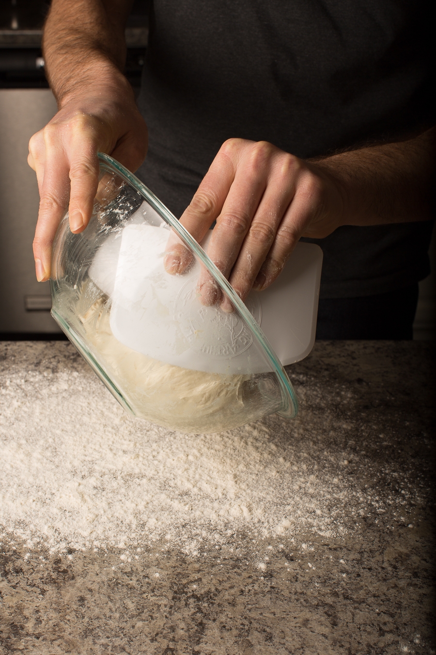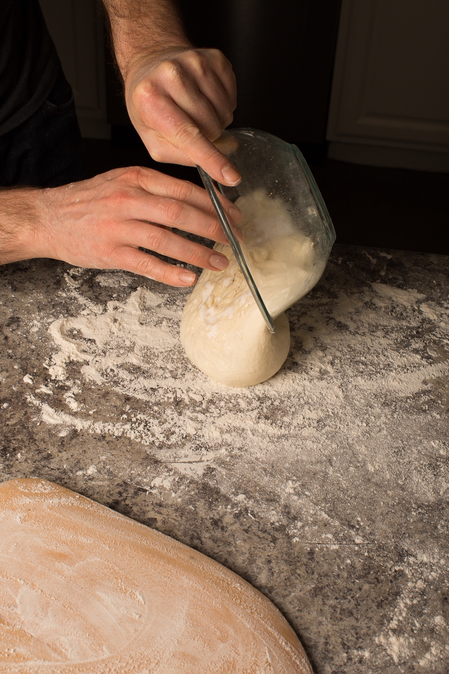 Use a bowl scraper to transfer the dough onto a well-floured surface – this inexpensive item makes it the ideal tool for working with a dough this wet. Make sure you use enough flour to keep things from sticking.