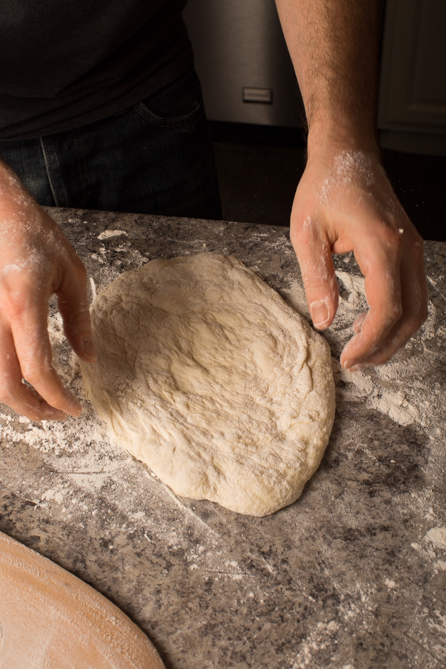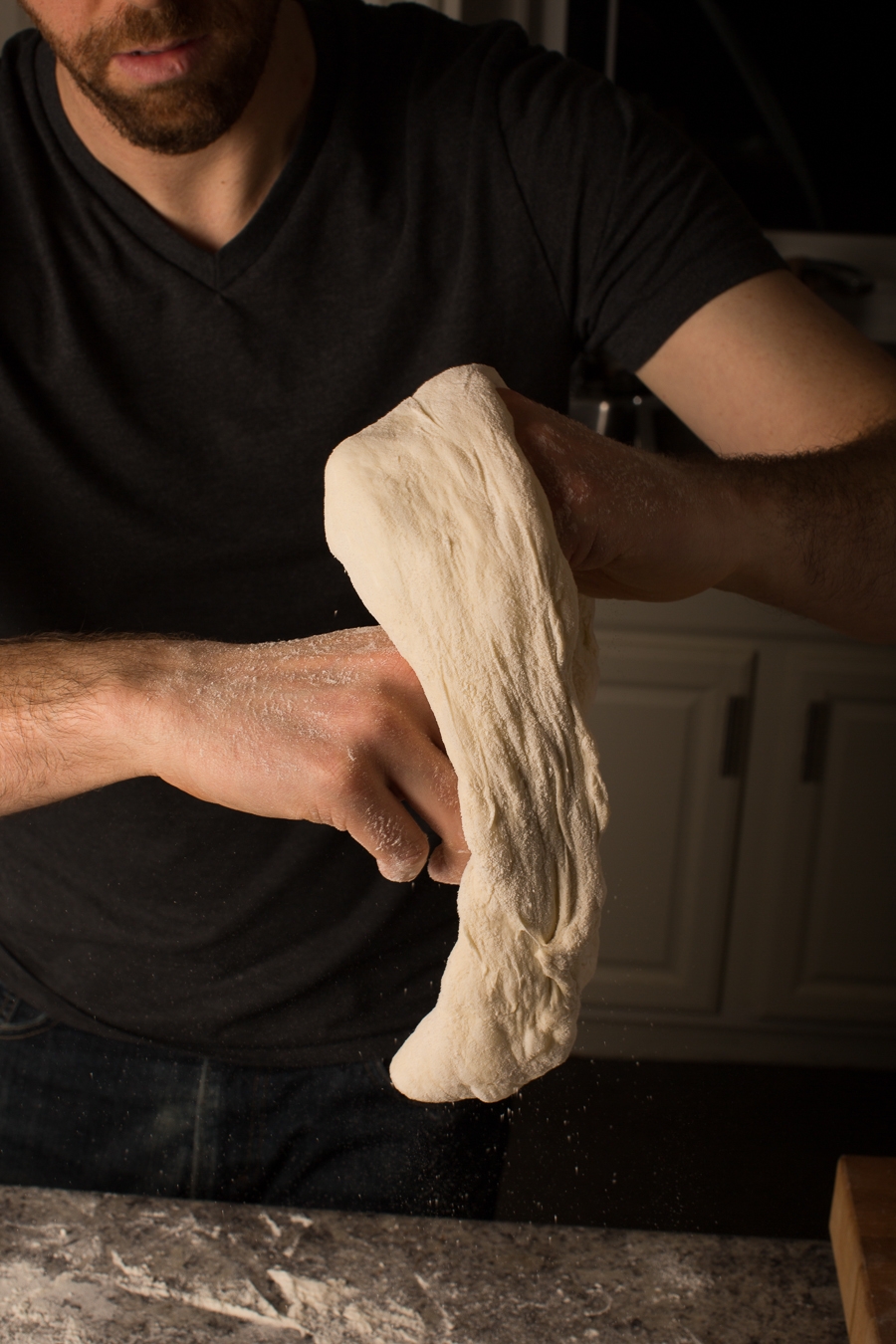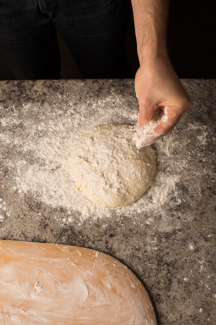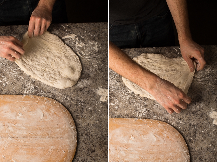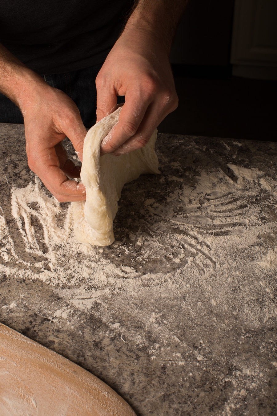 Above, Jeremy drags the dough through the flour on the counter top, making sure to flour both sides.