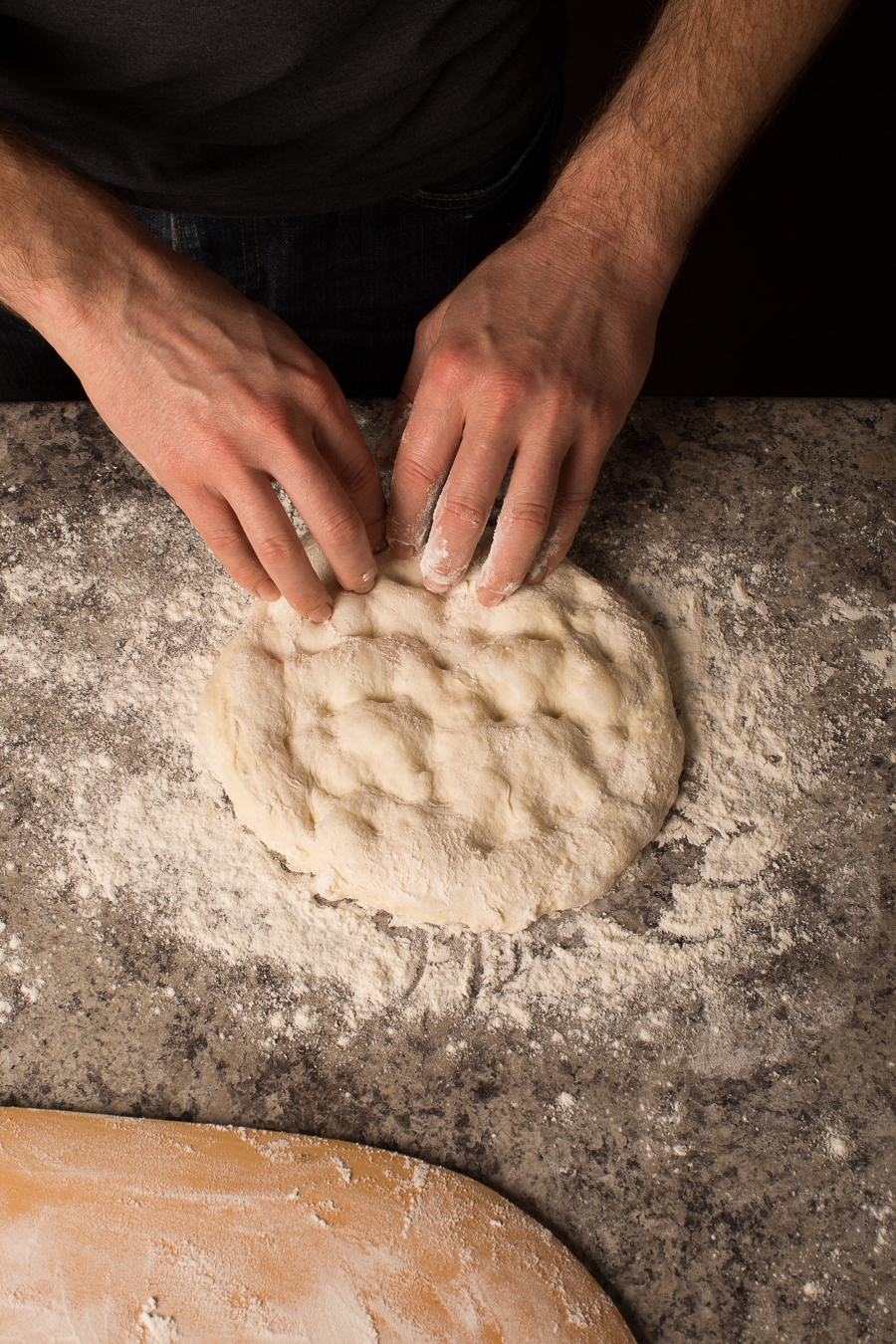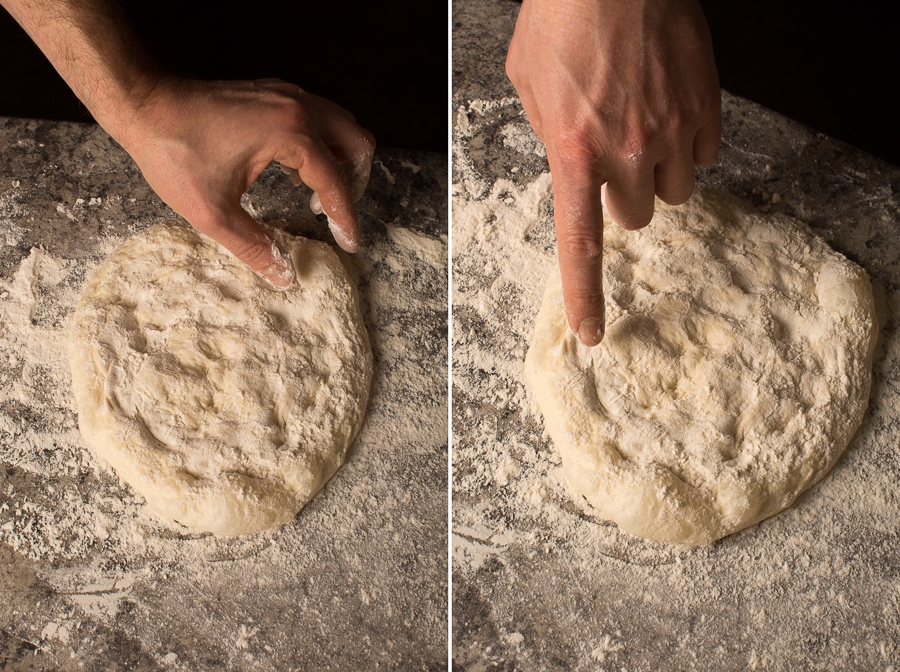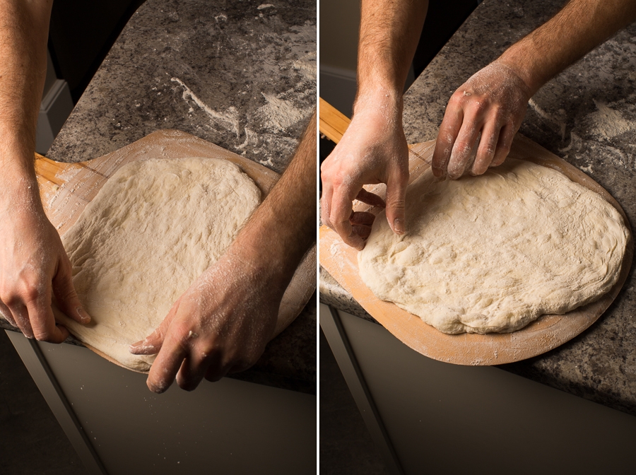 Using your fingertips, gently depress the dough, being careful to not touch the outer edge of the crust. This step is important – leaving the circumference untouched at this stage will result in a beautiful bubbly outer crust, post-bake.