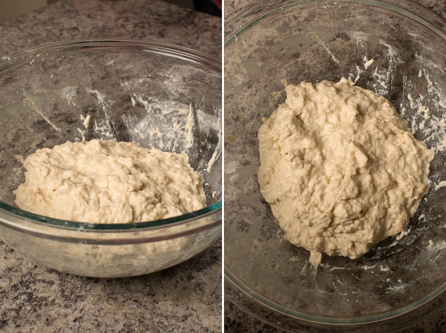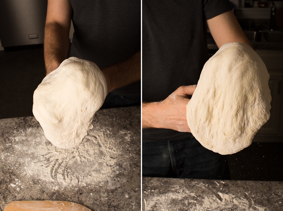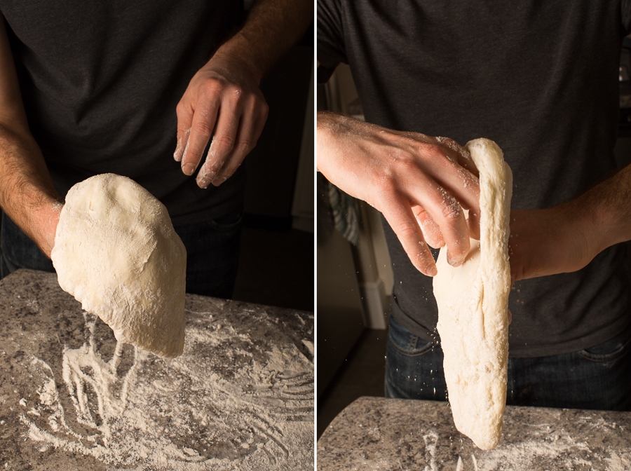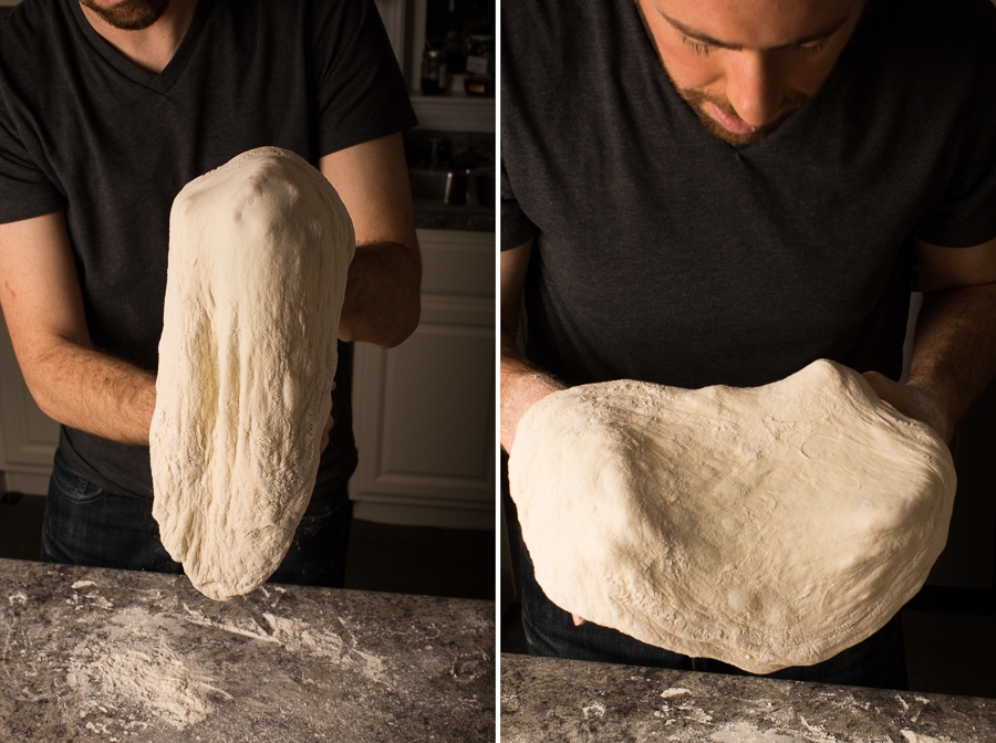 If your dough feels wet, use a generous dusting of flour on top. For a drier dough, use slightly less flour. Getting the exact amounts down requires some practice, but use these photos as a guide as you get started – for reference, this was a very wet dough.