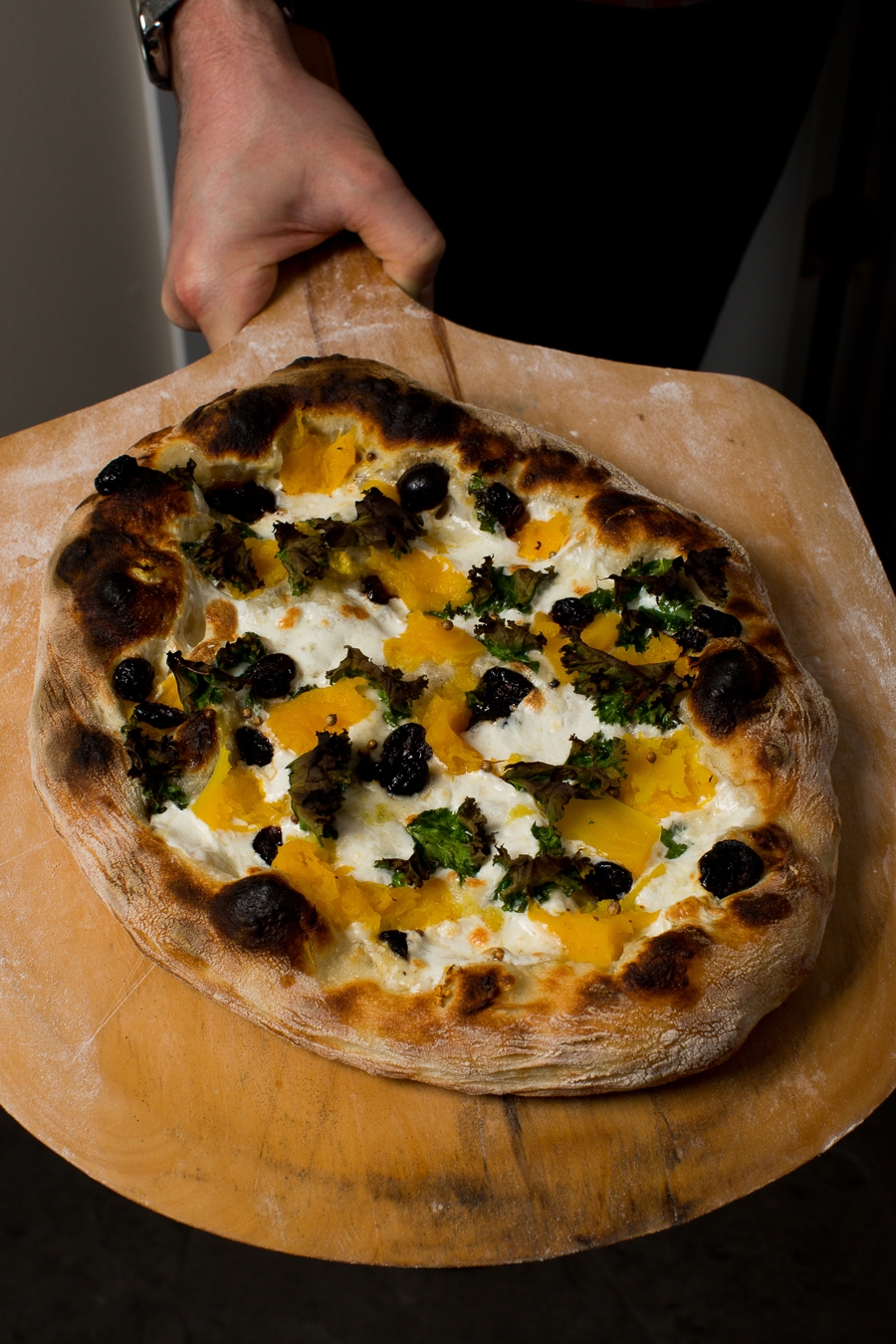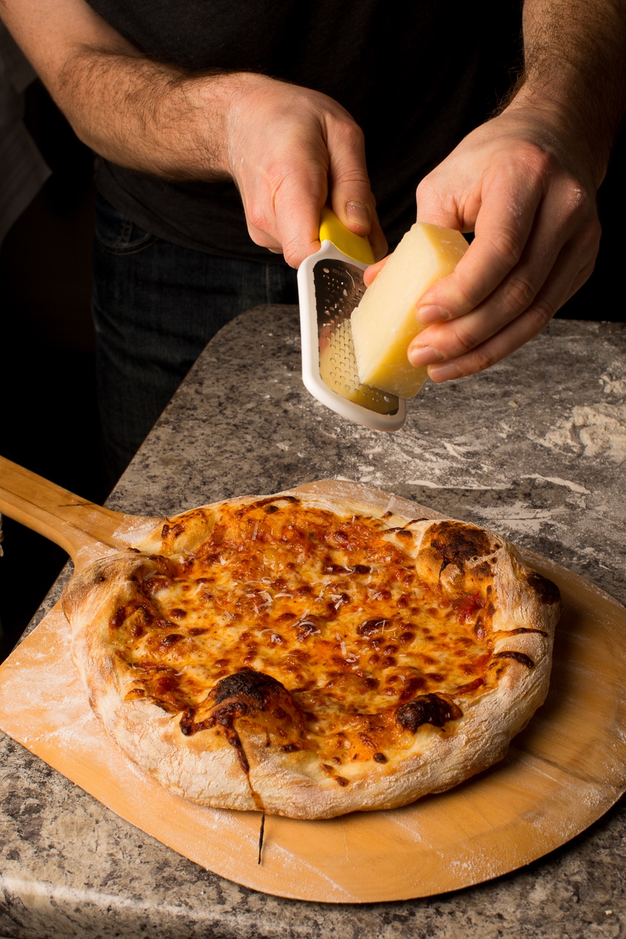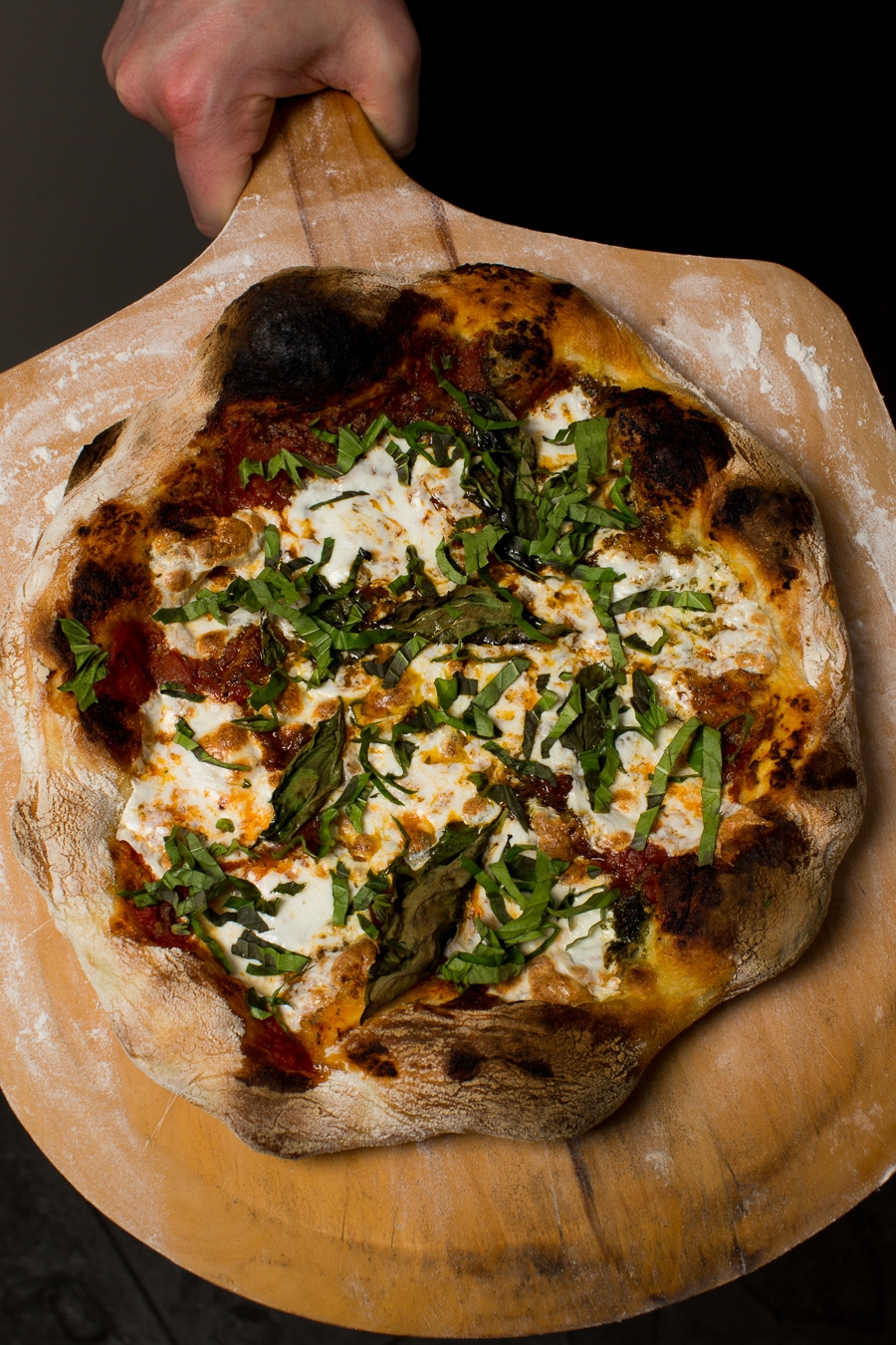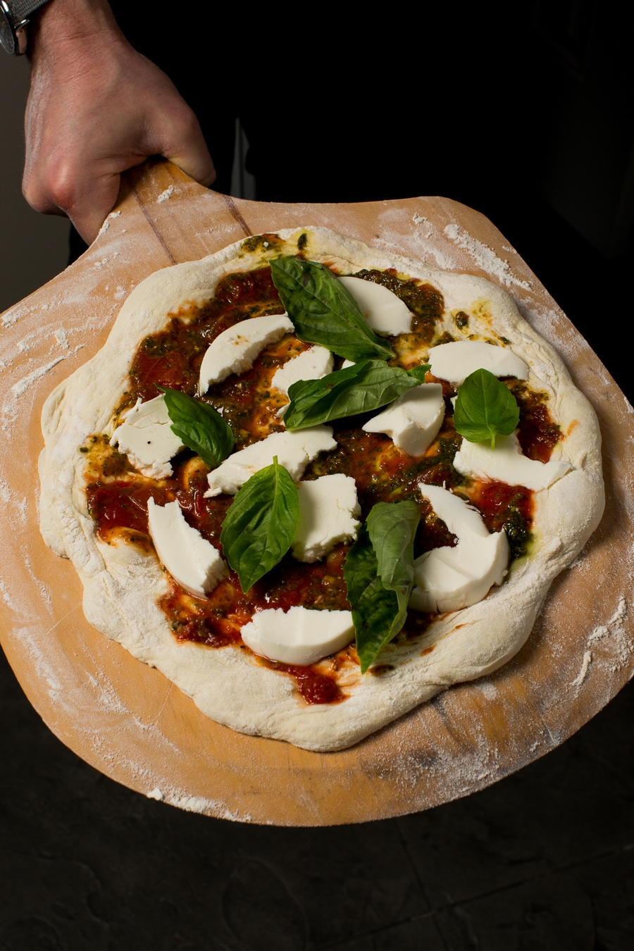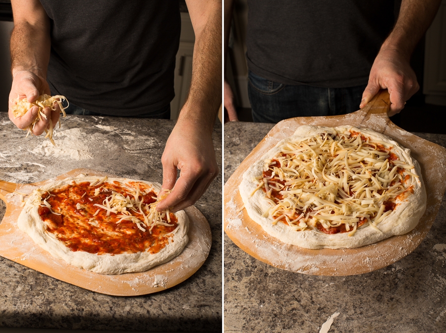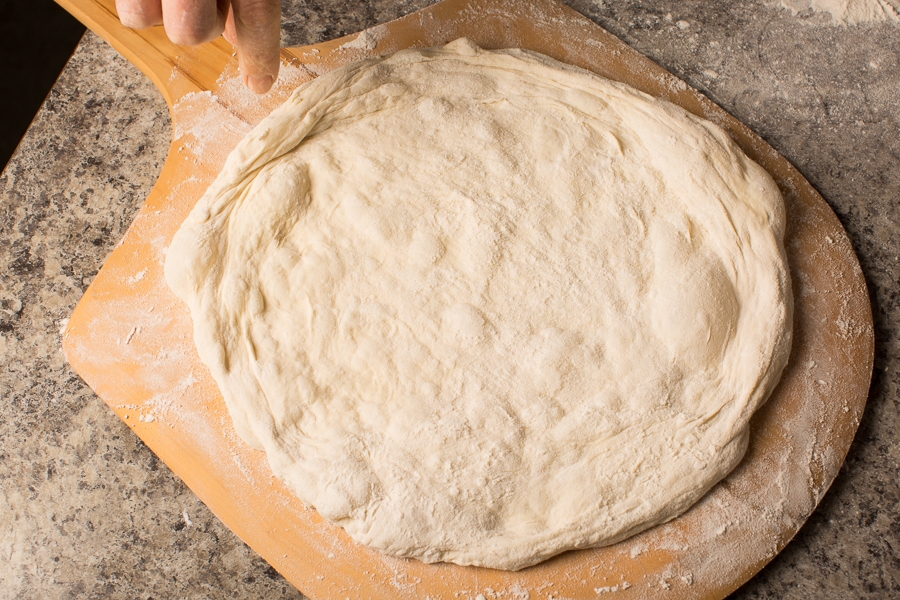 NOTE: if using a wooden peel with flour, be sure to apply your toppings quickly. The longer the dough sits on the peel, the more difficult it will become to release.