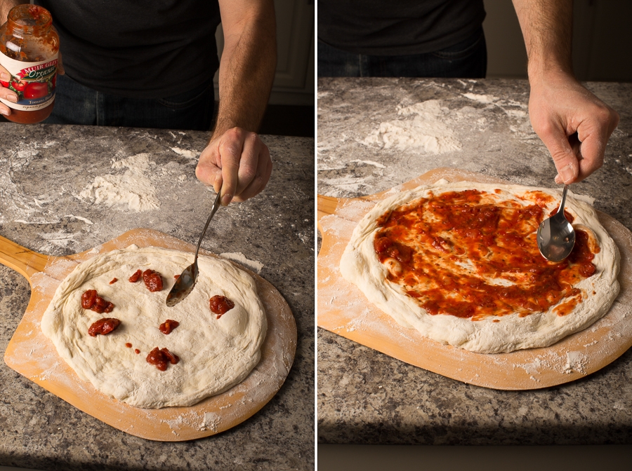 Lightly sauce the dough. We use regular pasta sauce, homemade or from a jar. Just make sure it's not too watery; simmer watery sauce until the above consistency is reached. Depending on the toppings, pesto or béchamel (recipe below) can be used as well.