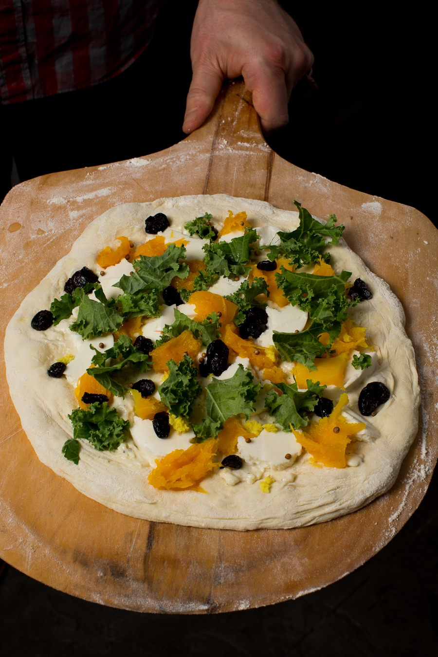 Want to mix it up? The variations are endless! Above is a white pizza, with lemon zest, ginger (also zested, using this amazing Microplane grater), fresh mozzarella, mashed butternut squash (left over from dinner the night before), dried cranberries, coriander seeds, and kale.