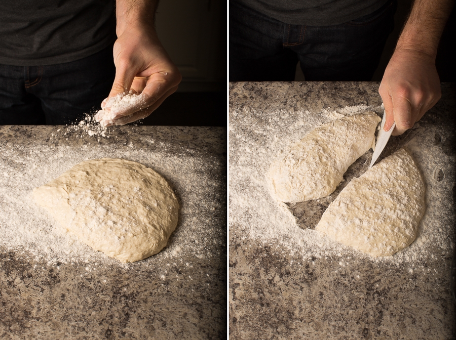 Dust the top of the dough with flour, then use a bowl scraper to cut the dough into two even sections.