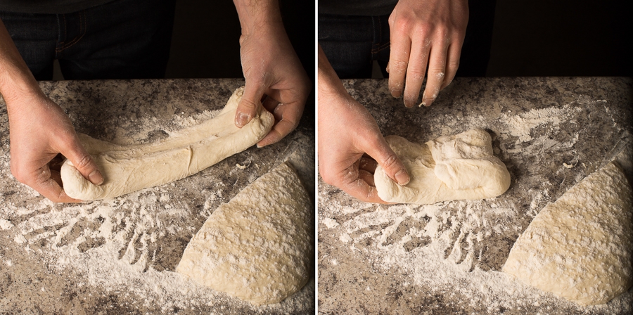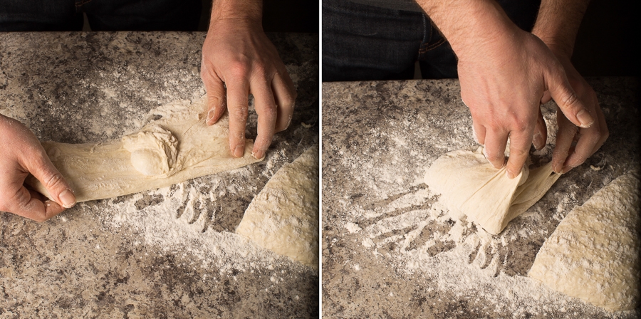 Holding onto the dough at two ends, pull one end away from the other, then fold it back onto itself. Repeat on the other side. As the photos show, the dough will likely be sticky – don't worry about it looking neat as you fold. Be sure to keep your hands floured as you work.