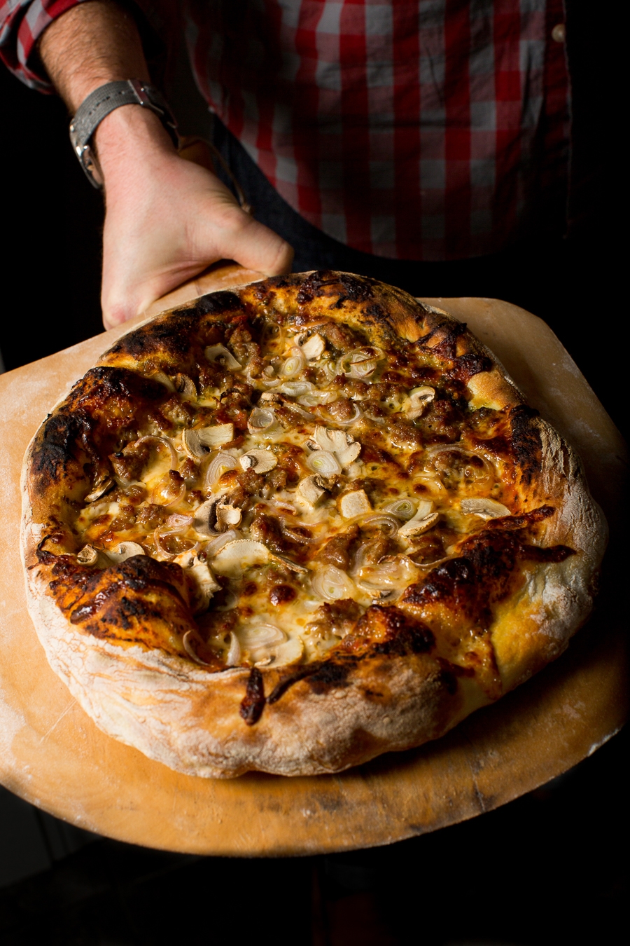Red sauce and pesto pizza topped with smoked mozzarella, sausage, shallots, and mushrooms.