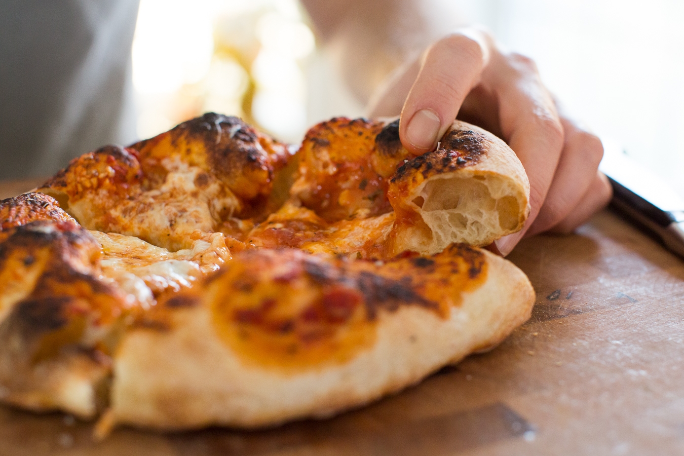 Again, using care to not touch the outermost edge of the crust, lift the pizza from the board and use your knuckles to gently stretch the dough. If the dough is at all sticky, use more flour.
