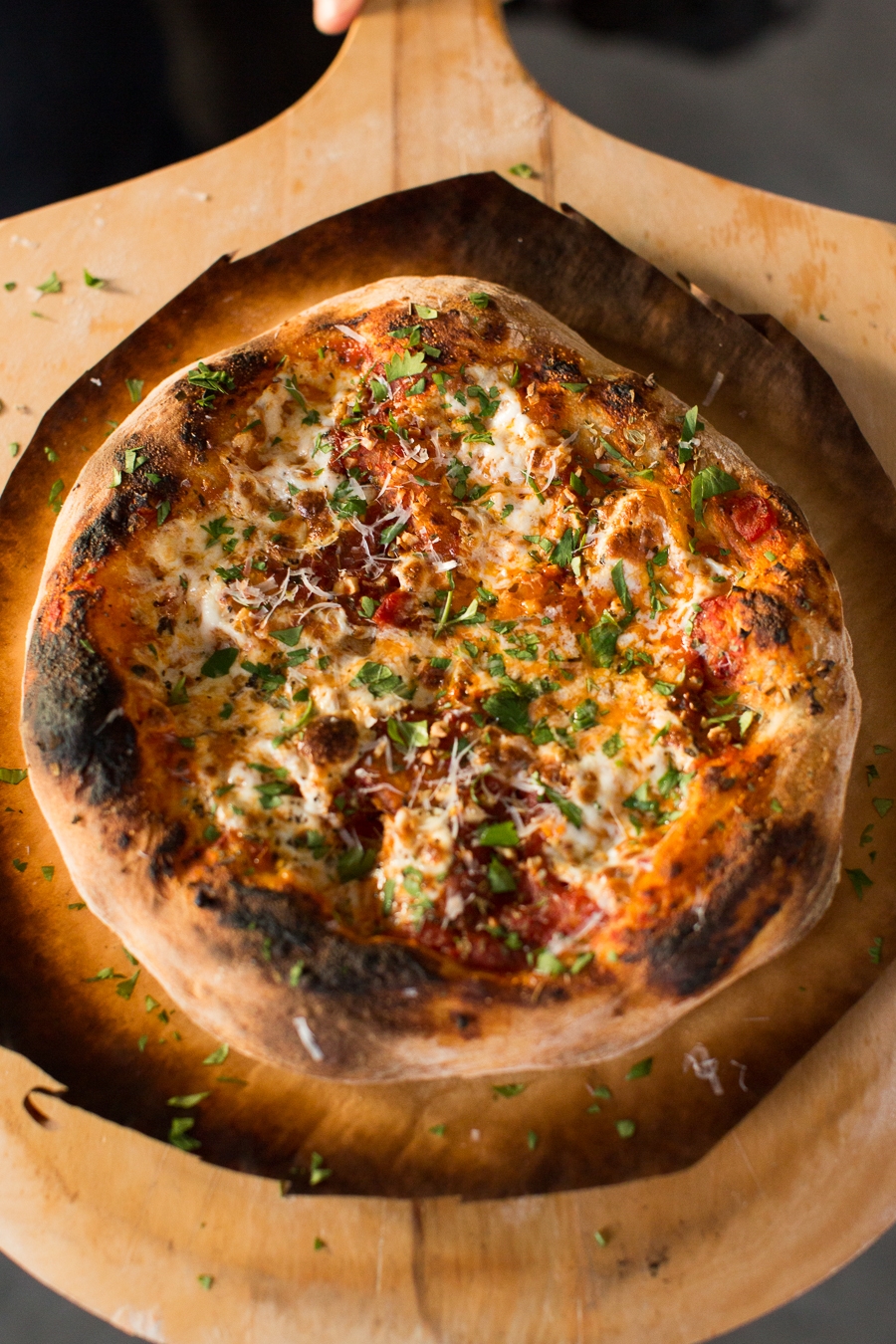 Special thanks to Jeremy Clauson, who took lots of notes and made more than a few pizzas in the name of perfecting this post. Thanks as well to my fellow blogger PJ Hamel, who risked flaming parchment and burned pizza to test the limits of this recipe!
