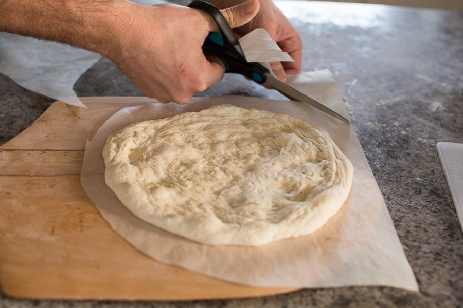 If using parchment, trim the excess around the dough to prevent it from burning. We generally leave an inch around the dough, but to be safe we recommend trimming the paper flush with the dough.