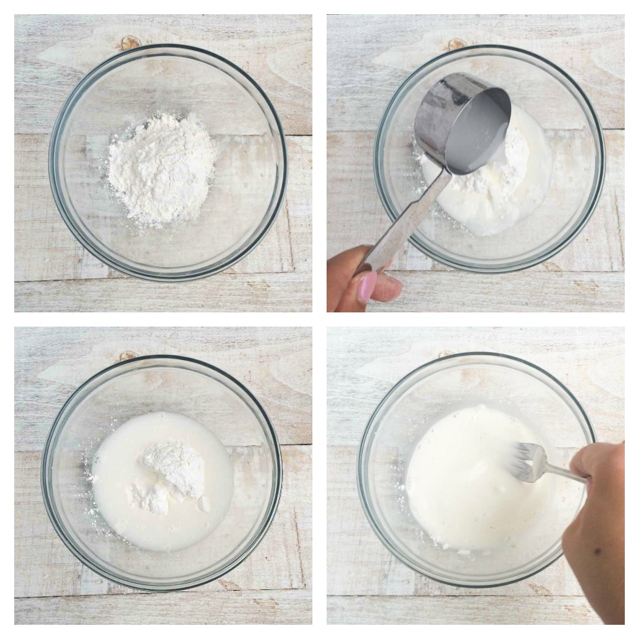 Finally, in a third bowl, beat together 1/4 cup (28g) cornstarch and 1/4 cup (57g) water to create a slurry.