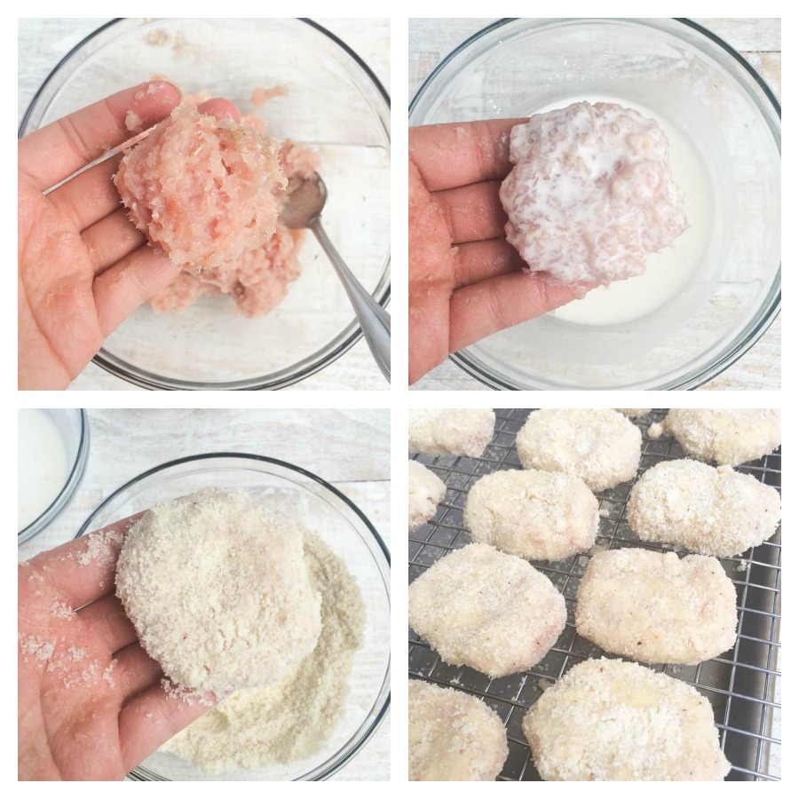 With wet hands, take about 2 tablespoons of chicken and shape it into a small disk. Coat first in almond flour, then dip in the cornstarch slurry, then coat again in almond flour and transfer to the wire rack.