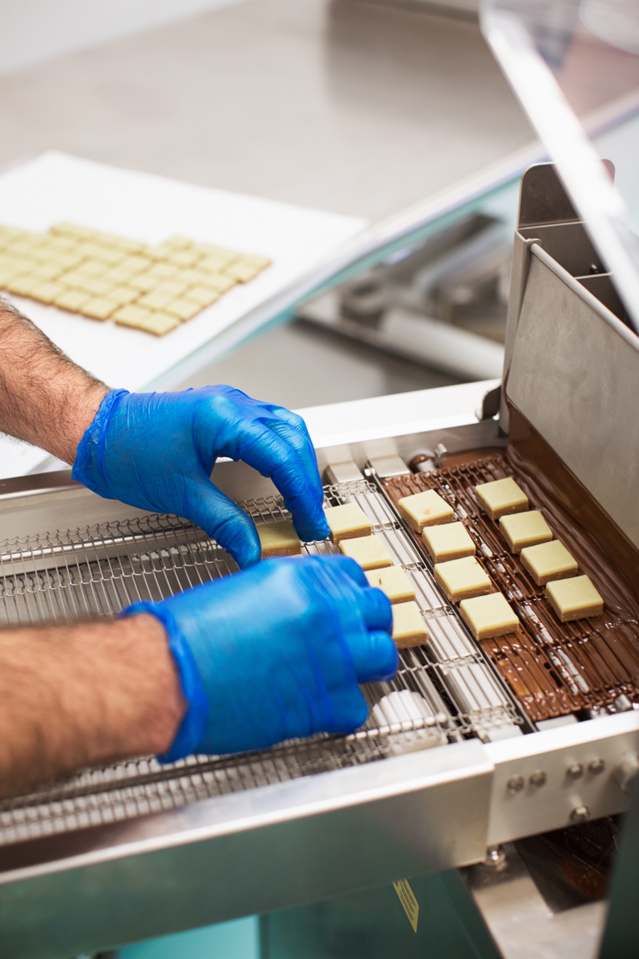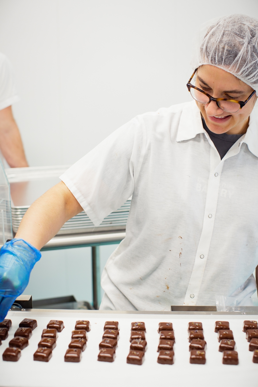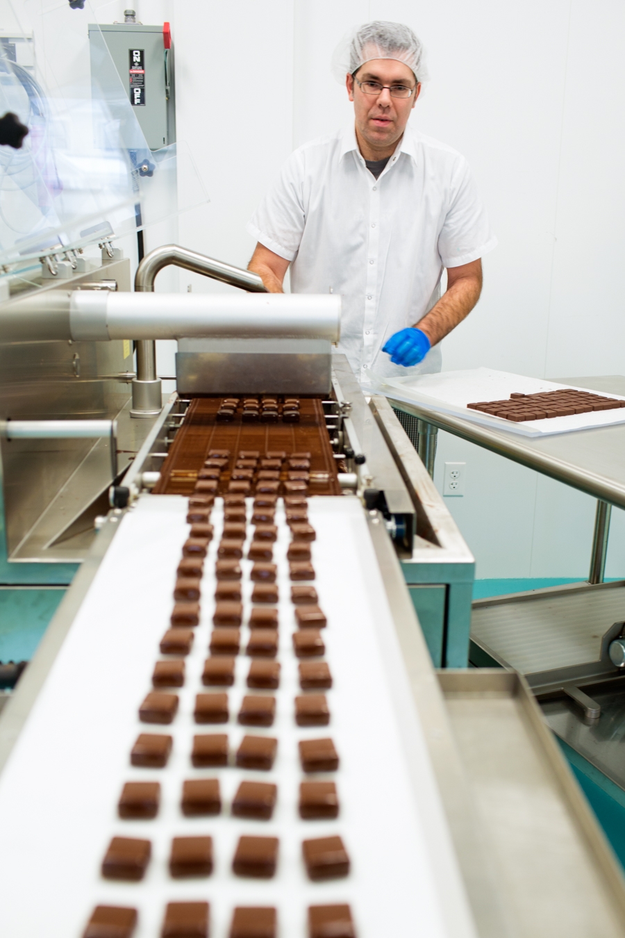 Wilhelm describes the new chocolate room as "artisan meets industrial." The room is environmentally controllable, and provides space for the specialized equipment used in the chocolate confection-making process – such as the enrobing machine above. The technology challenges King Arthur's bakers to bring their artisan approach to a production setting.