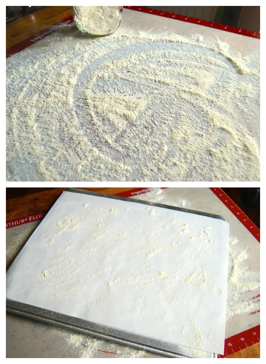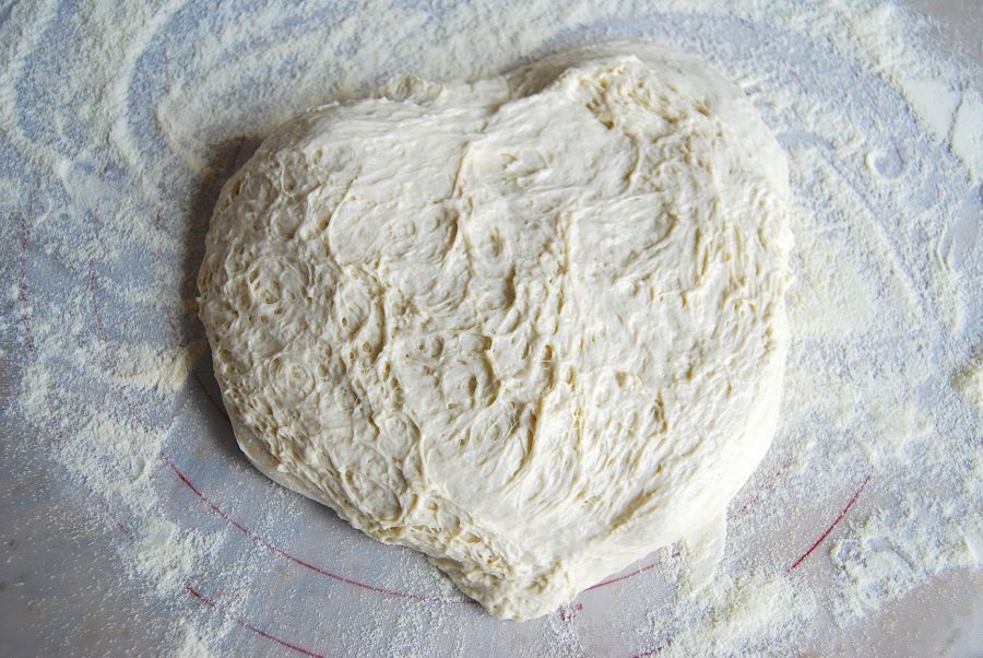 Flour your work surface with flour, or with a 50/50 mixture of semolina and flour, which is what I choose.