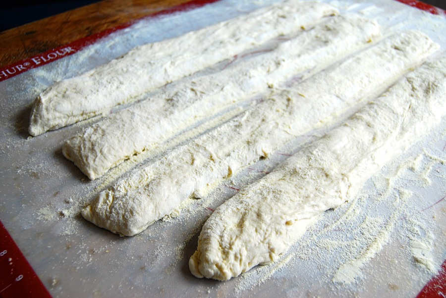 Divide the rectangle into four longer, skinnier rectangles, using a "thick, dull tool." I'm using a wooden ruler here. Fromartz explains that, rather than cutting the loaves, you want to simultaneously divide them and compress their edges to seal.