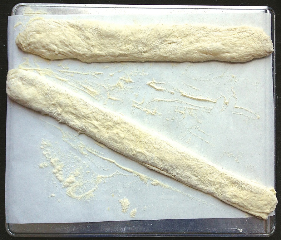 Place two of the loaves onto your homemade peel. They'll want to stretch as you handle them, so do this quickly.