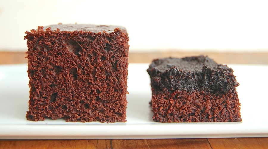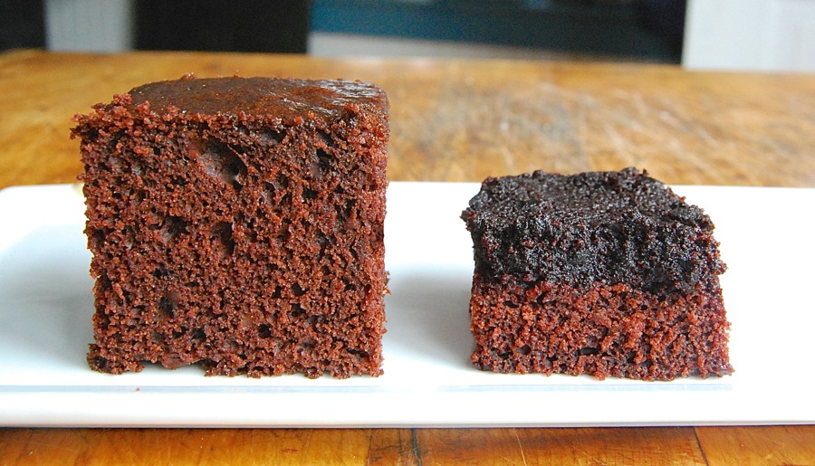 Its flavor is decent, but texture? Hard/stiff around the edges, dense/moist inside. And hey, what's with that peculiar dark, soggy top, which magically formed as the cake baked?