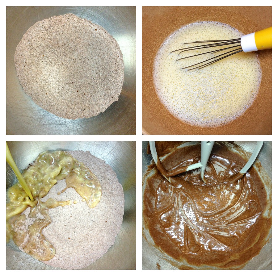 I whisk together the dry ingredients; whisk together the liquids; then pour liquid into dry, and stir to combine, making a typical-looking cake batter: thick and glossy.
