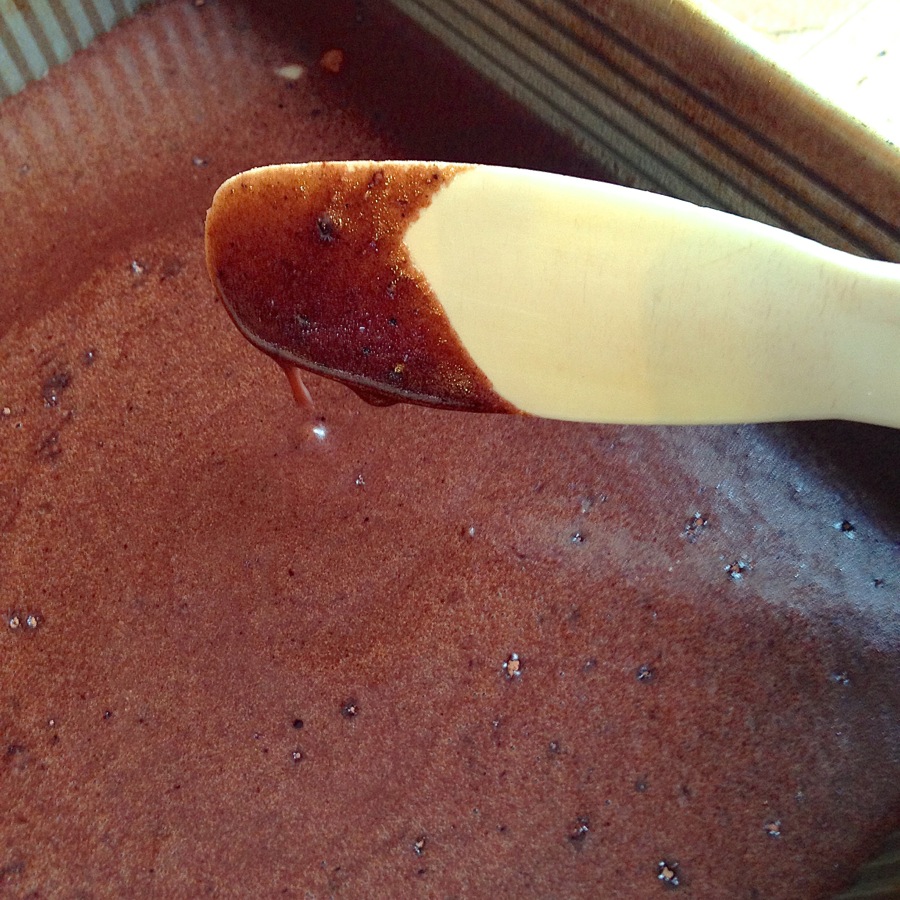 And here's the result when I follow my original Cake-Pan Cake recipe, substituting GF flour for all-purpose flour, but making no other changes. The batter is watery and thin.