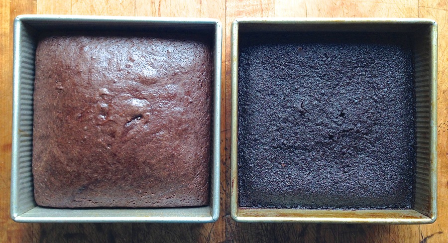 That's the eggs/xanthan gum cake on the left; the recipe subbing only GF flour on the right. Not only are they very different colors...