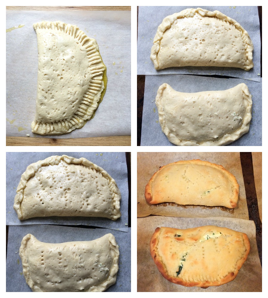 Seal the edges with the back of a fork, then roll the edges up. Transfer the calzones (and their parchment paper) to a baking sheet and prick each calzone with a fork a few times – this will let the air escape, and help ensure the edges don't pop open.