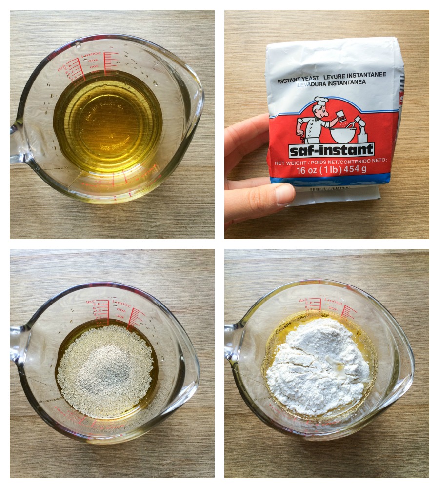 Start these calzones by preparing our gluten-free pizza dough. Mix together the following ingredients in the bowl of a stand mixer: