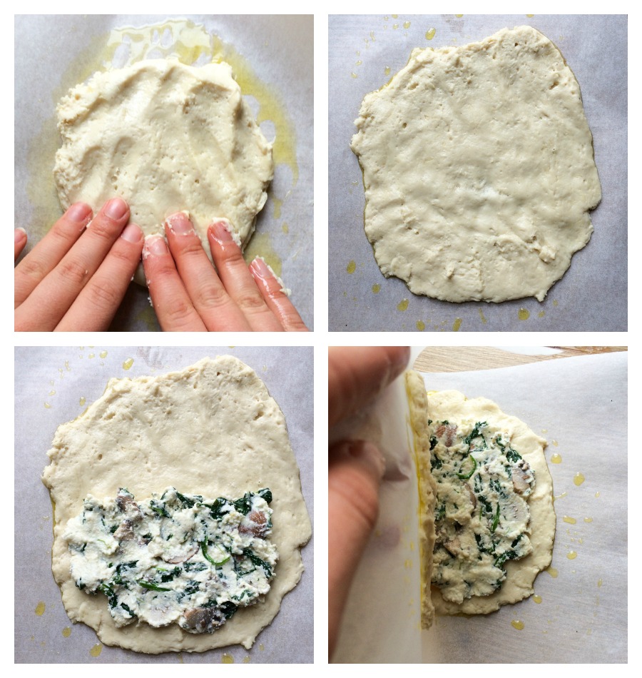 I decided to add just a few more tablespoons of flour to our gluten-free pizza crust recipe so it would be a little thicker, and got to work. I followed the recipe exactly and chose this filling (with mushrooms and an egg) – and it totally worked. On the first try!