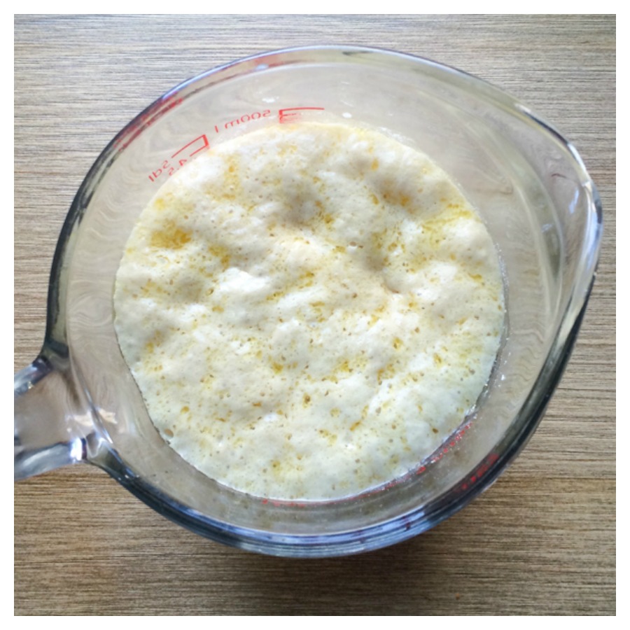Set aside for 30 minutes or so, until the mixture is bubbly and smells yeasty. It will look nice and fluffy, as shown above.