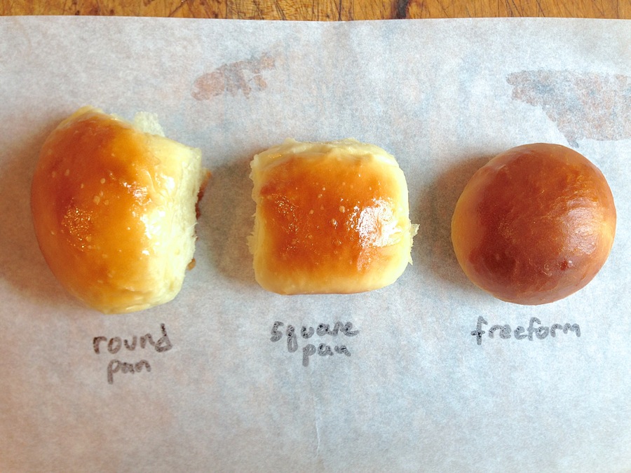 The rolls in the round pan bake up elongated or even triangular. Those in the square pan end up square. Well, square-ish; they could pass as round. And the free-form rolls retain their initial round shape entirely.