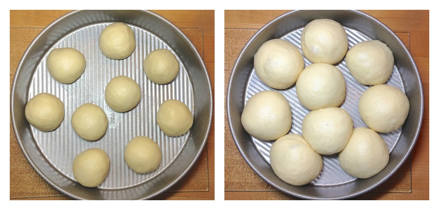 Nine rolls go into an 8" x 8" x 2" square pan. Which is the same volume as a 9"x 2" round pan – did you know that?