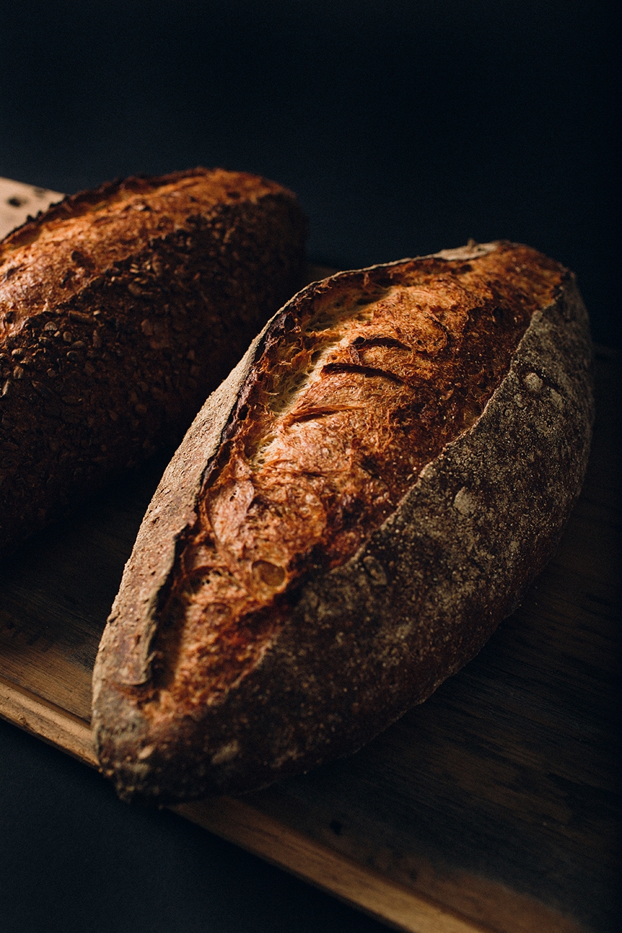 Named after a memory from Martin's youth, the Boxcar brims with Southern flavors – caramelized pecans, native flint corn, toasted rye berries, smoked barley malt, whiskey, and molasses make up the base of this hearty, flavorful loaf. Smoked Lapsang Souchong tea adds a hint of tobacco flavoring, pulling us deeply into the memory of a childhood spend in the South.