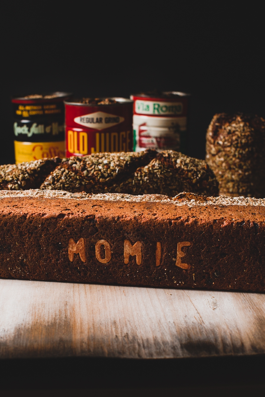 This PowerBROT can bread was inspired by Martin's great grandmother, Momie, who preferred to bake the bread instead of steaming it, as it was traditionally prepared. Martin's formula is a marriage of his great-grandmother's brown bread recipe and a traditional German Vollkornbrot, containing whole wheat, whole cornmeal, whole rye, molasses, oat groats, flax meal, flax seeds, and dried blueberries. The loaf is coated in a mix of pumpkin seeds, whole teff berries, and rye chops.