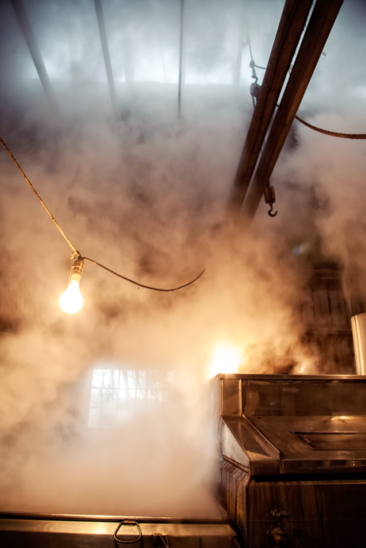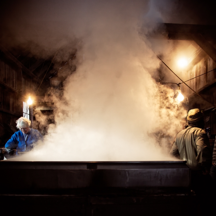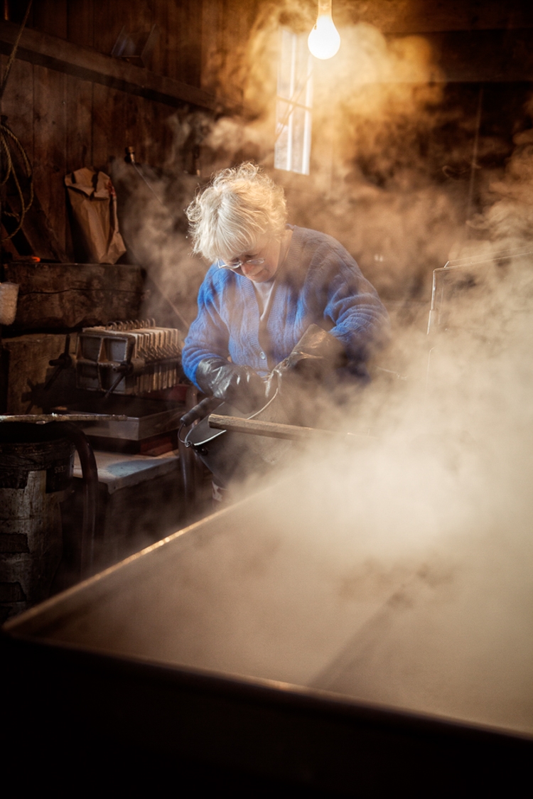 Step into the boiling room and you immediately encounter a wall of thick, sweet steam. A handful of bare lightbulbs cast an orange hue over the evaporator, where Harold moves purposefully from one end of the house to the other.