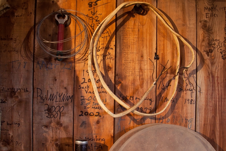 The inside of the family sugarhouse – over 100 years old – bears the names of as many men who have worked there over the years. Important dates are recorded as well – the first boil of each season, memorialized in wax pencil on the wooden walls.