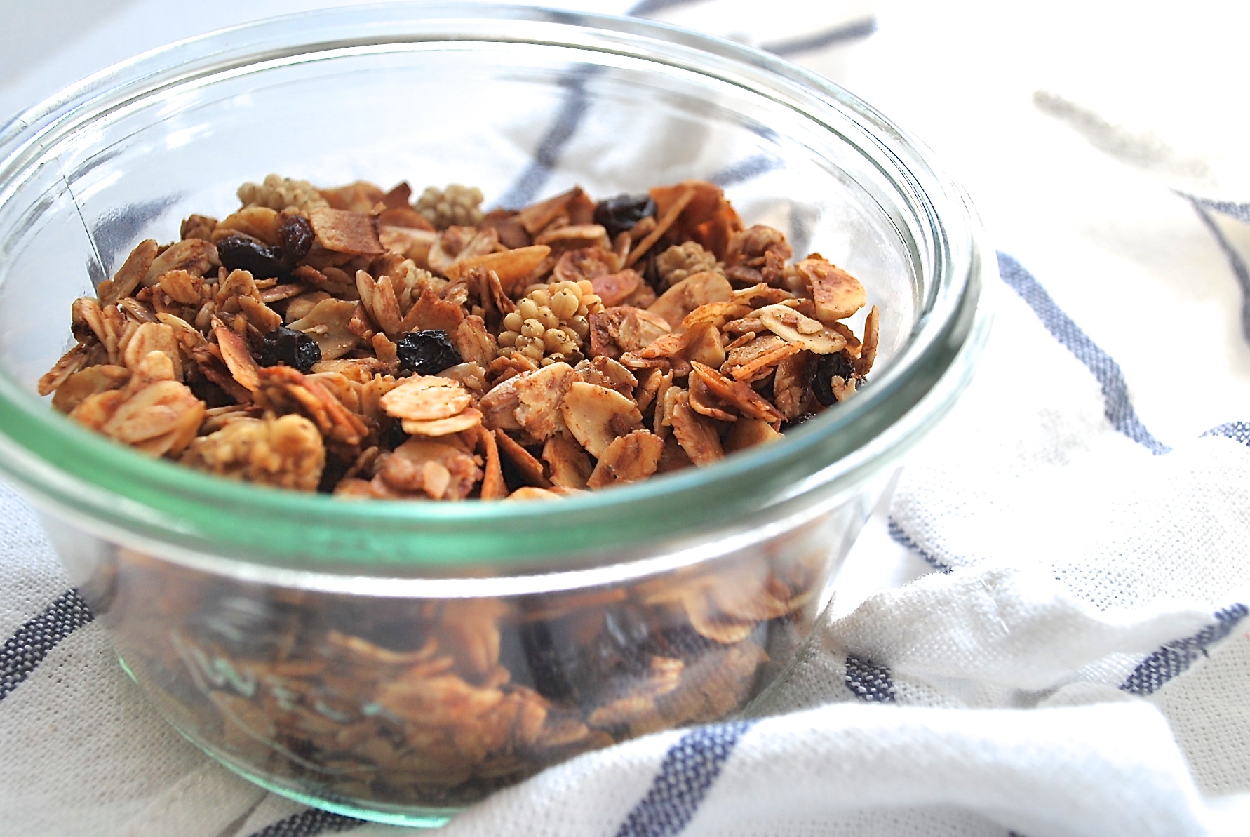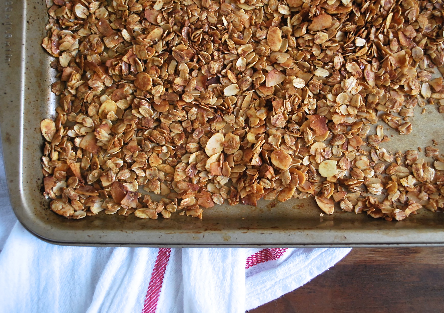 Then you need something to bind the granola together and make it nice and clumpy. Olive oil and melted coconut oil are my favorite choices here; use 1/2 cup of either one (or a mixture of both). If you like a crisper, clumpier granola, add more oil. If you like your granola really on the clumpy side (think granola clusters), try adding an egg white to your mixture. If you're looking for a healthier cereal, you can substitute applesauce (or even pumpkin) for the oil. Keep in mind that this is a loose rubric – tweak it as you see fit.