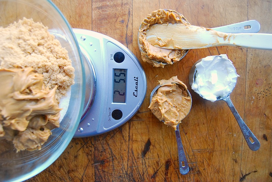 Or, if I didn't have a scale – "Hmmm, 1/4 x 1 1/2 = 3/8 cup. That's kind of between 1/3 and 1/2, isn't it? Or maybe I should use the 1/4-cup and fill it 1 1/2 times..." See how measuring by volume can lead you down the slippery slope to inaccuracy?