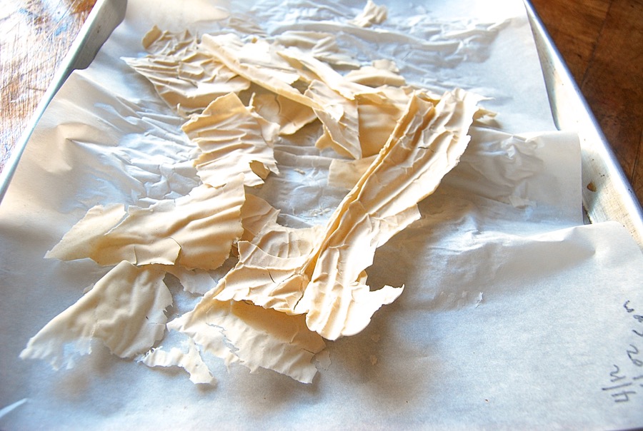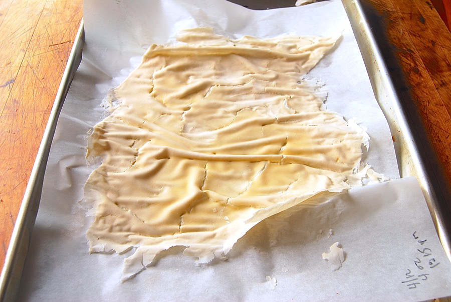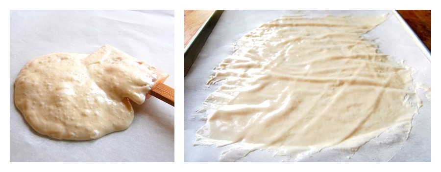 Next, spread it – all of it* – onto two pieces of parchment. It helps to set each piece of parchment on a baking sheet, simply for ease of transportation.