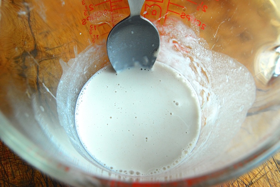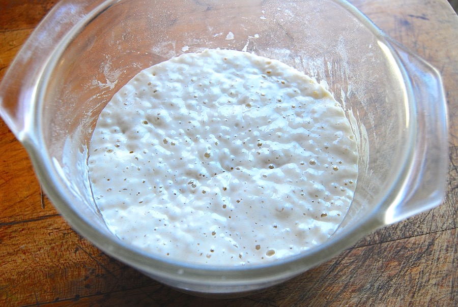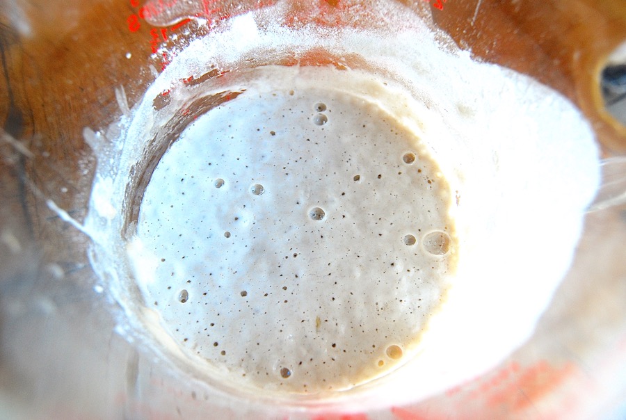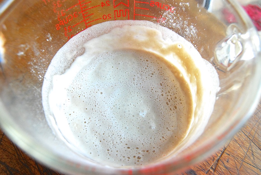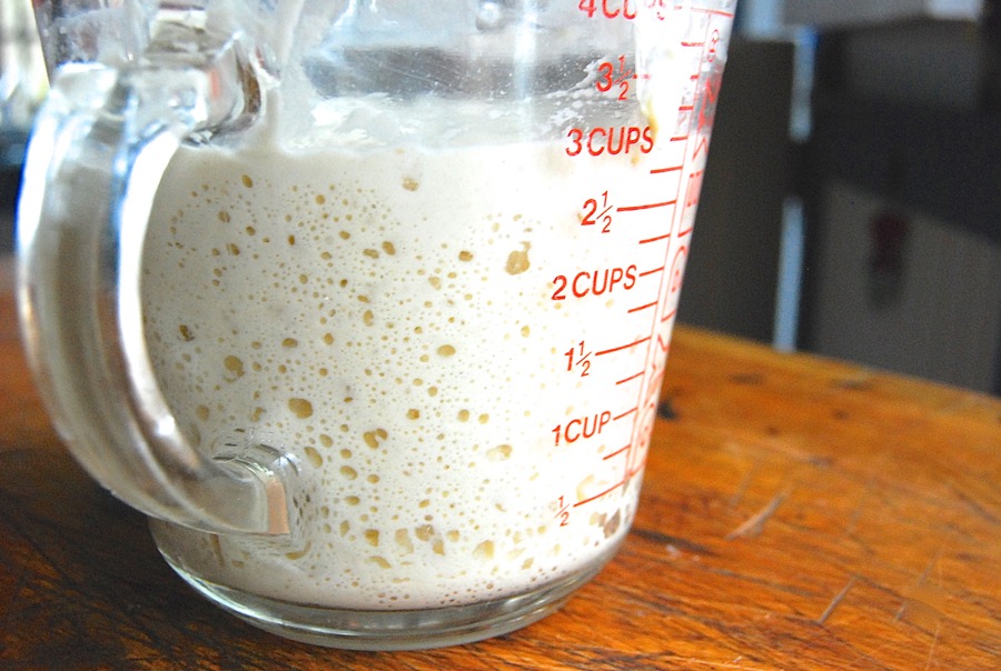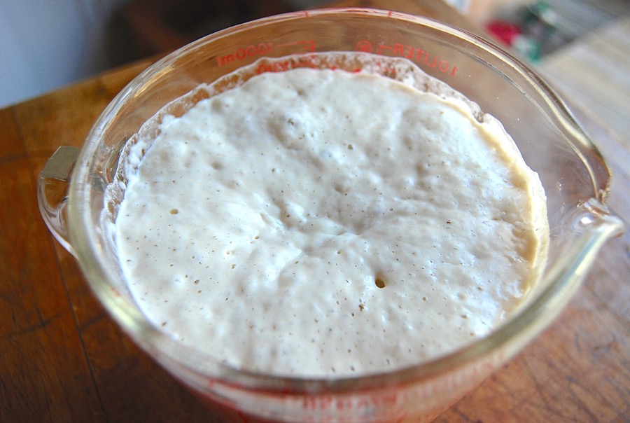 First, feed your starter as though you were going to bake with it. If it's been stored in the fridge, take it out, and feed it with equal parts unbleached all-purpose flour and lukewarm water. Let it rest, covered, until it becomes very bubbly and healthy looking.