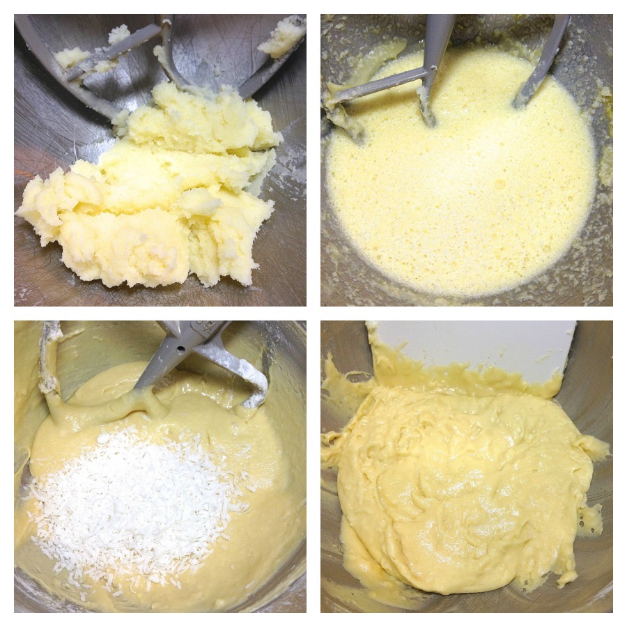 Stir in the salt, baking powder, coconut flavor, and vanilla. Add the flour to the bowl in three portions, alternating with the cream, and beginning and ending with the flour. Beat at low speed, just to combine, after each addition.