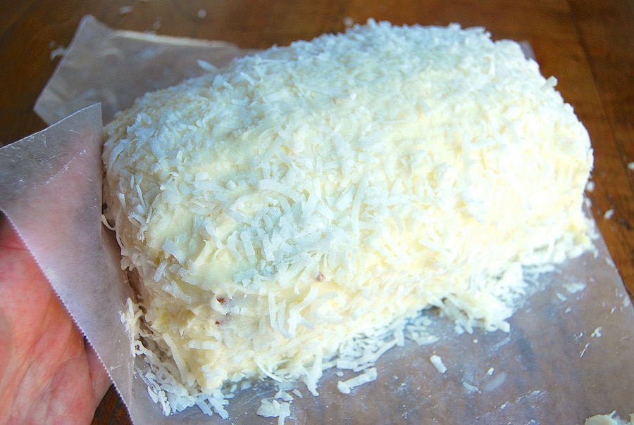 Pat the flaked coconut onto the frosting. This will be sticky work; use the paper or wrap to help. I've used a bit less coconut here; feel free to go overboard if you like!