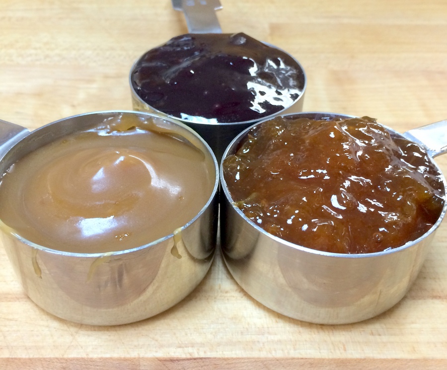 Clockwise, from top: raspberry jam, orange marmalade, caramel ice cream topping.