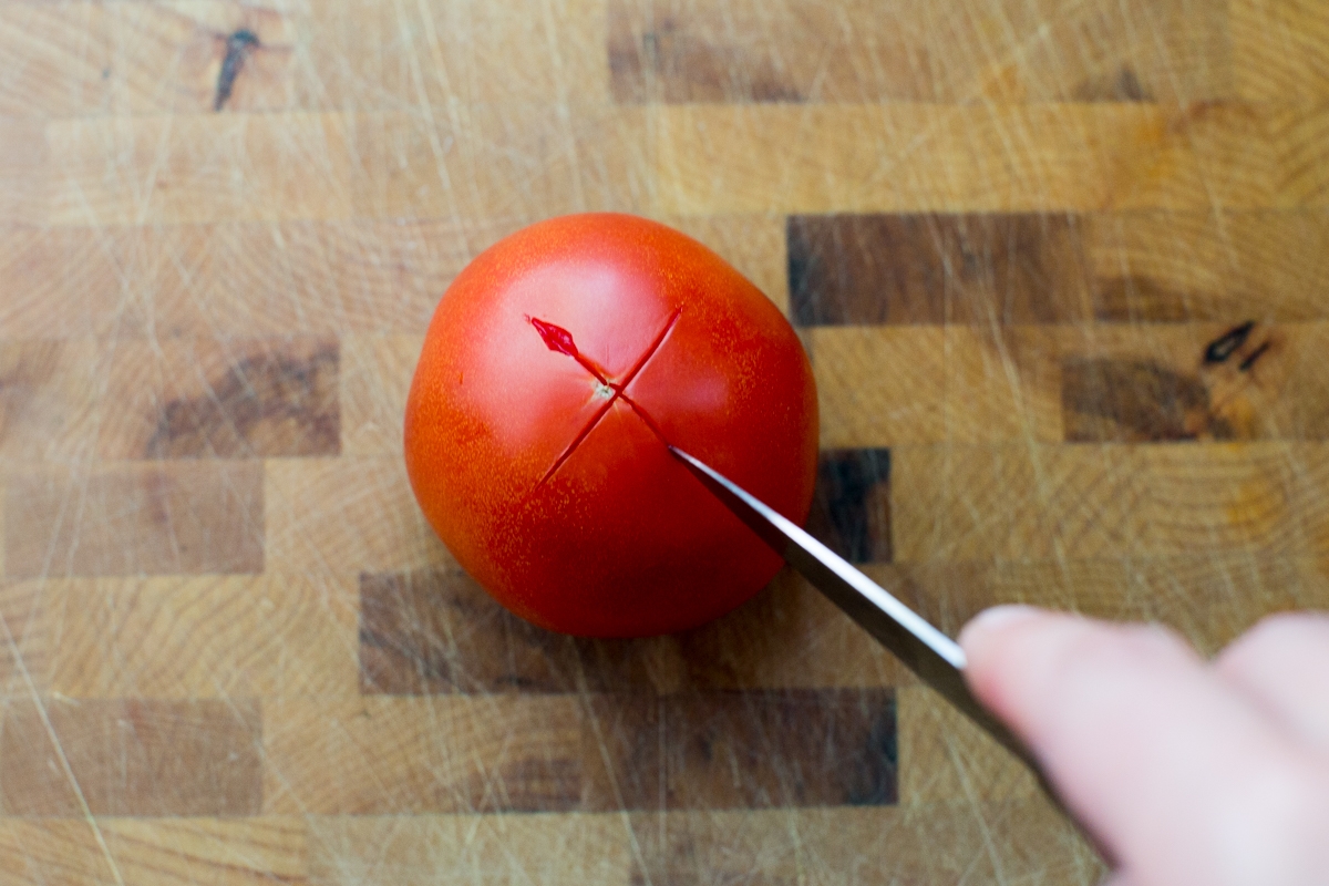 Start by scoring the skin of your tomatoes on the bottom, opposite the stem. Take care not to cut too deeply into the flesh.