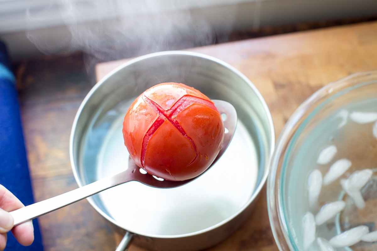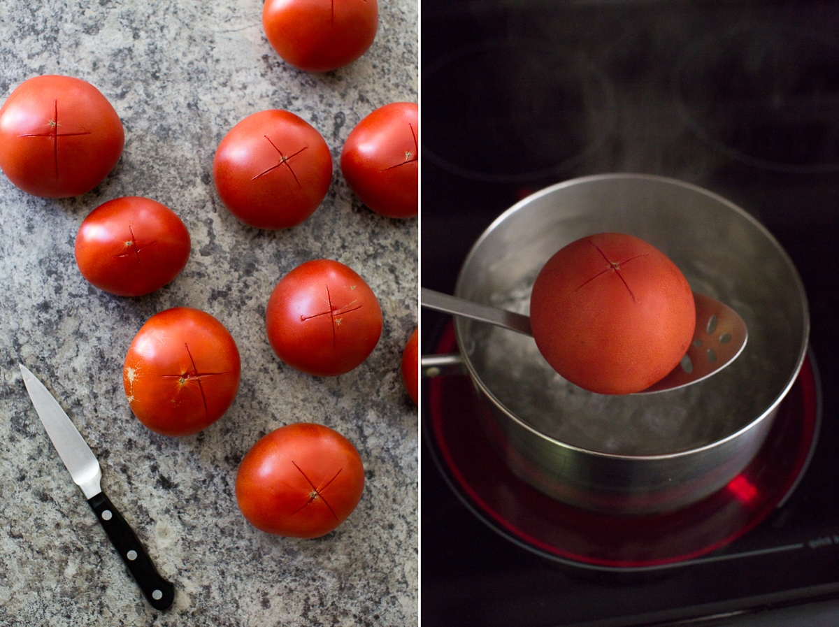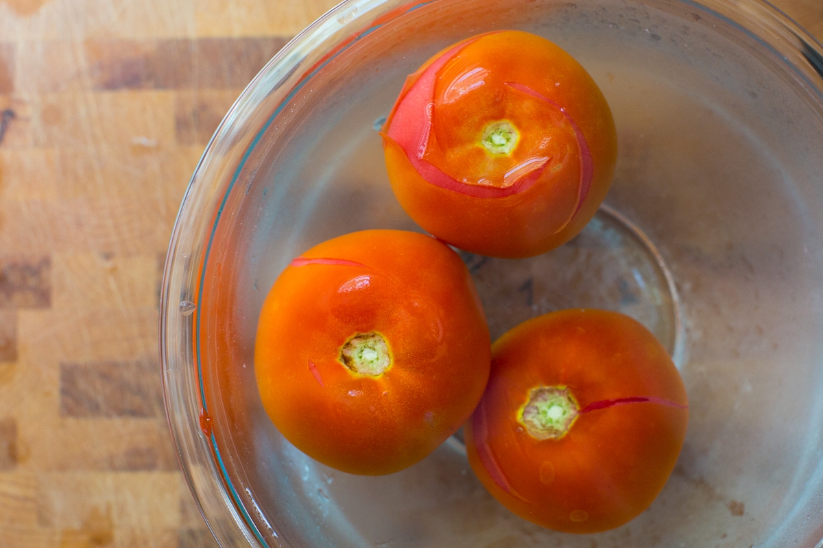 Peel the tomatoes as soon as they're cool enough to handle – their skins should slip right off. If they don't, you may need to leave them in the boiling water for a few more seconds.